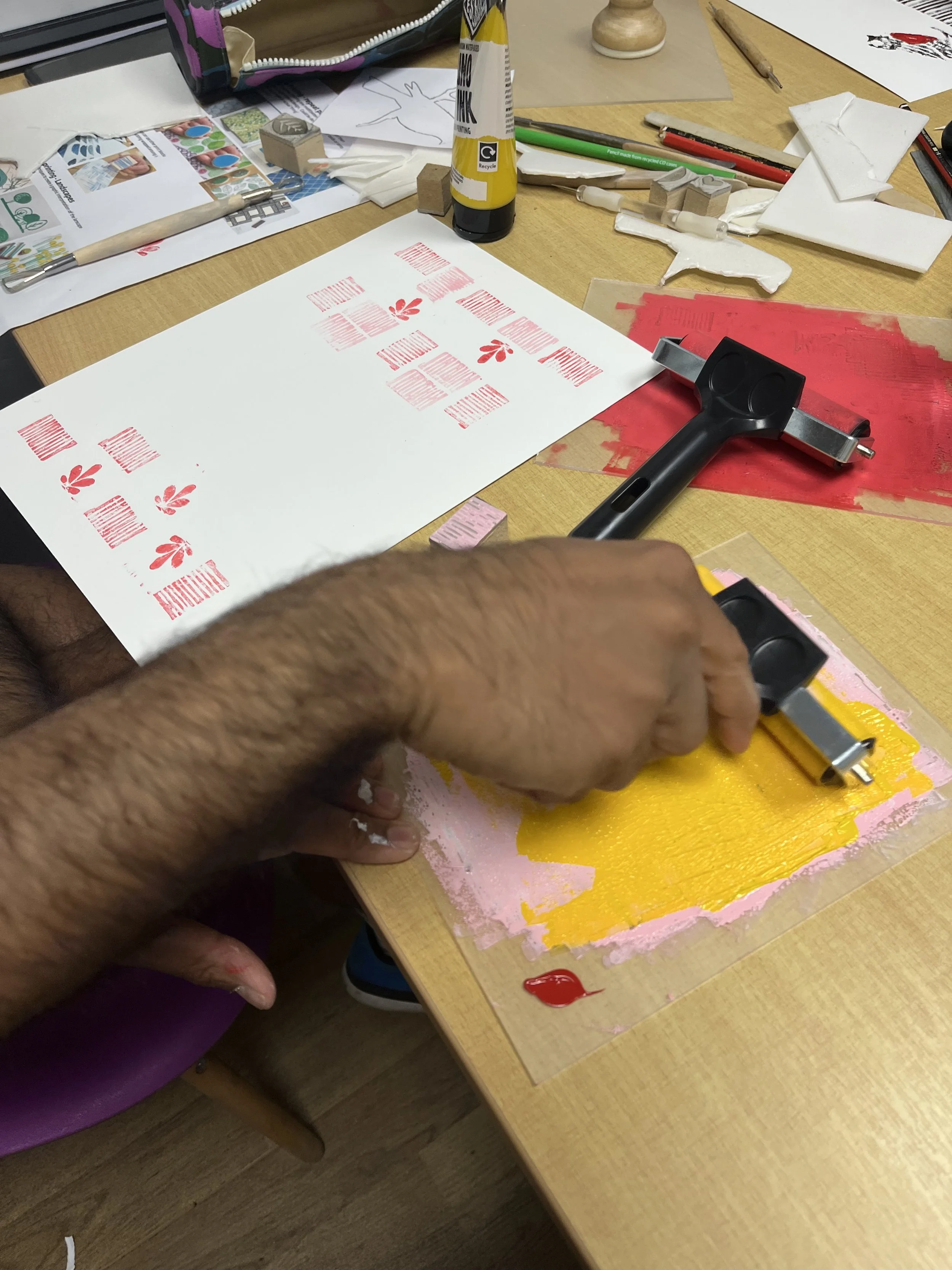 For project #14 I’m once again working with Michael House hostel for the homeless. This project is a monthly creative workshop event and each month we will look at a different creative discipline and create artwork through a variety of different mediums. Week 1 we did print making using handcarved styrene and small stamps.