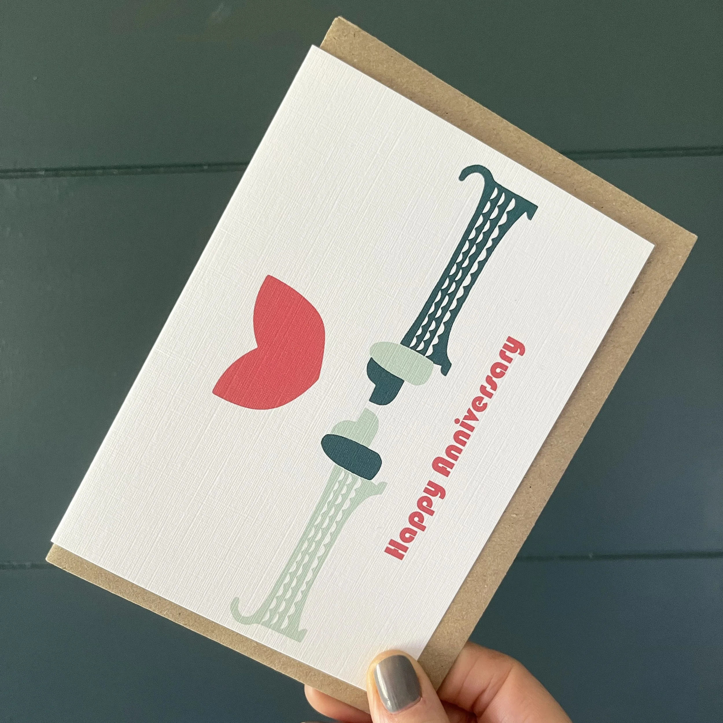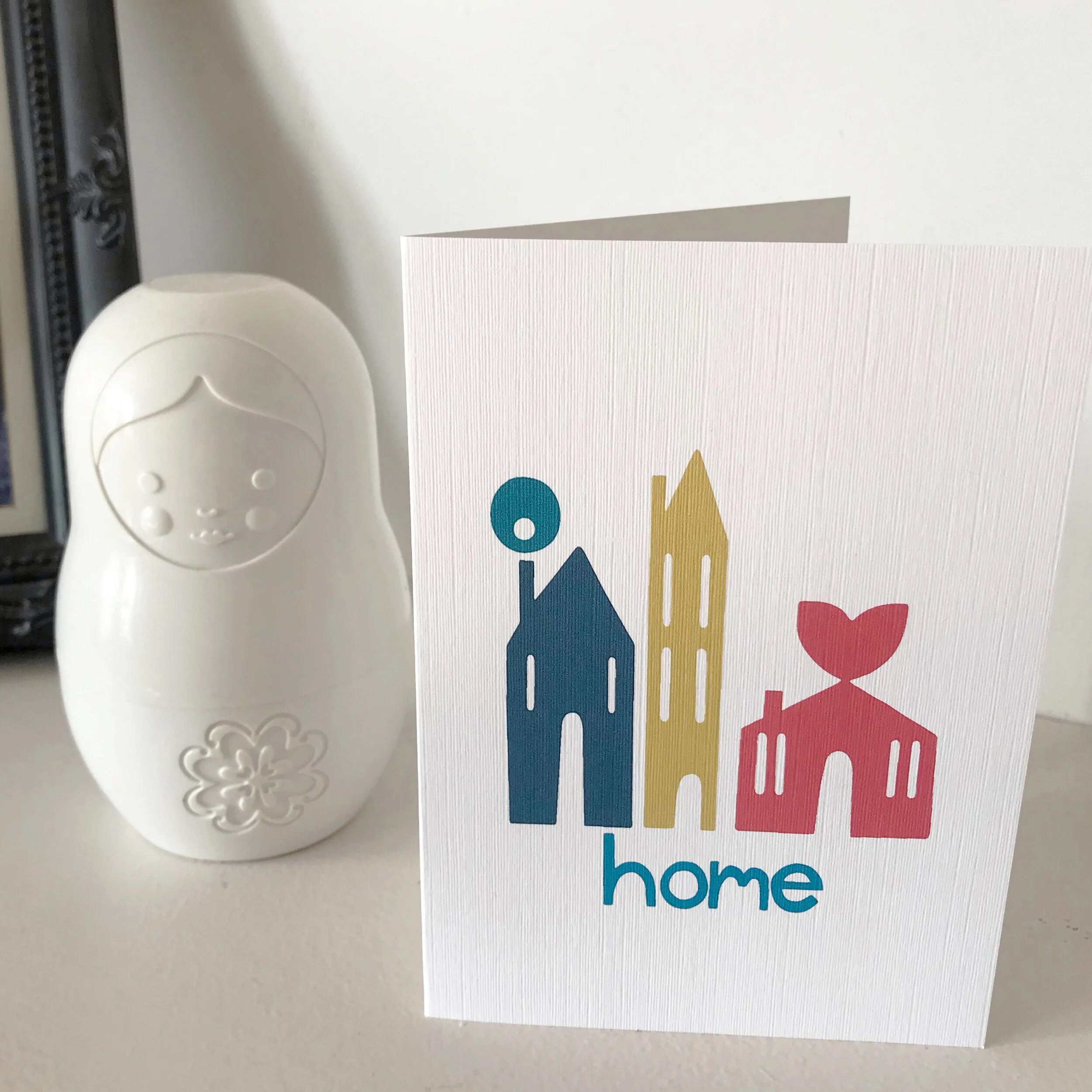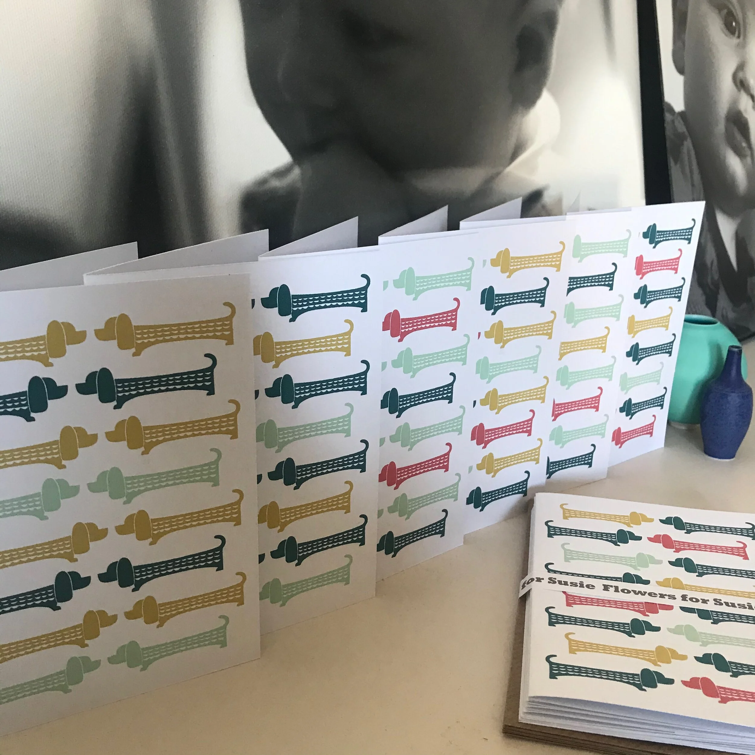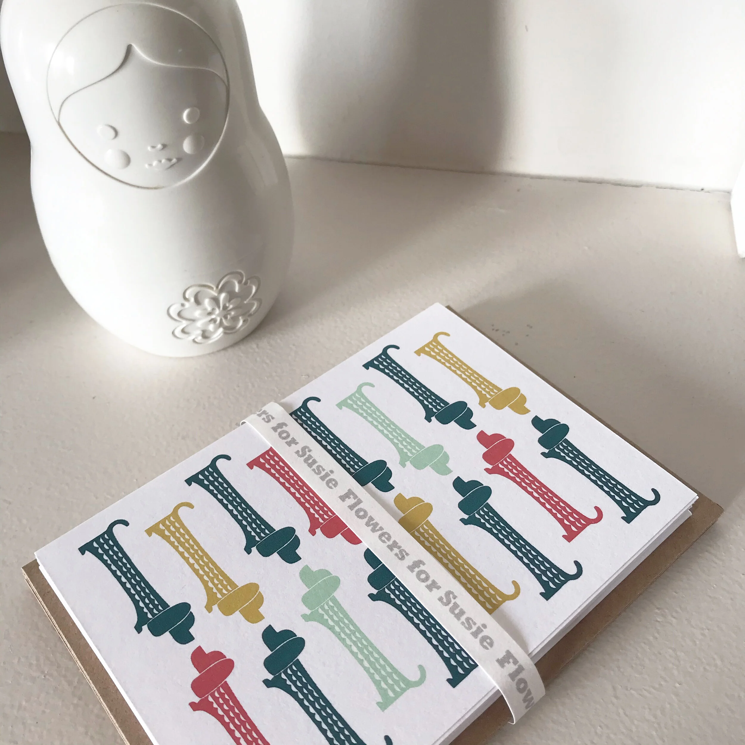 A high quality inkjet print on 260gsm linen textured white card this A6 card also comes with a beautiful steel grey envelope. The cards and envelopes are bound by a paper band making the cards and their packaging totally recyclable