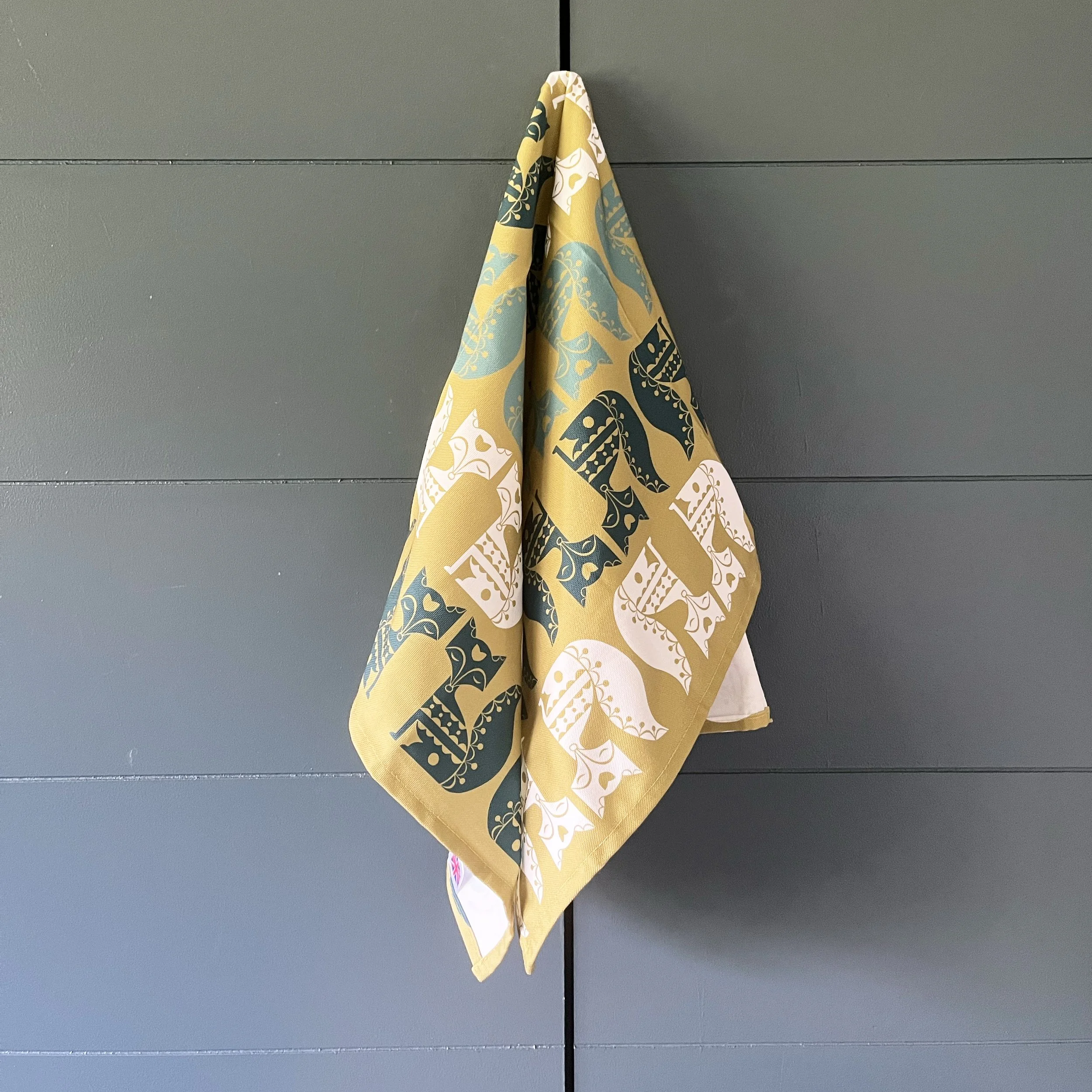 A rich, bold offset repeat bird design in orange, teal, olive yellow, duck egg and vintage white this Bird tea towel will make a rich colour statement in your kitchen.